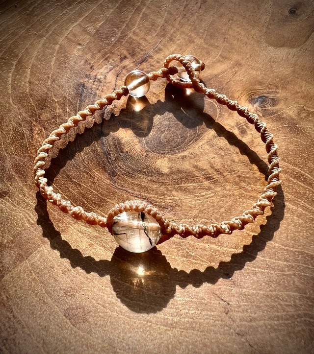 霊性を開いたパワーストーンブレスレット 内径 約18cm タールインクォーツ 11.83mm こちらのブレスレットは、マクラメ紐で編み上げております。ポイントのパワーストーンは、タールインクォーツでエンドの石は水晶です。 タール イン クォーツは、悪いものを排出して浄化すると言われ、数ある天然石の中でもオールマイティな力を発揮し、古くから邪気払いにも使われているそうです。冷静に物事を判断する目、困難が立ちはだかったときに立ち向かう力を高める効果があると言われています。 豊かな毎日のアイテムとしてお使いいただければ幸いです。
