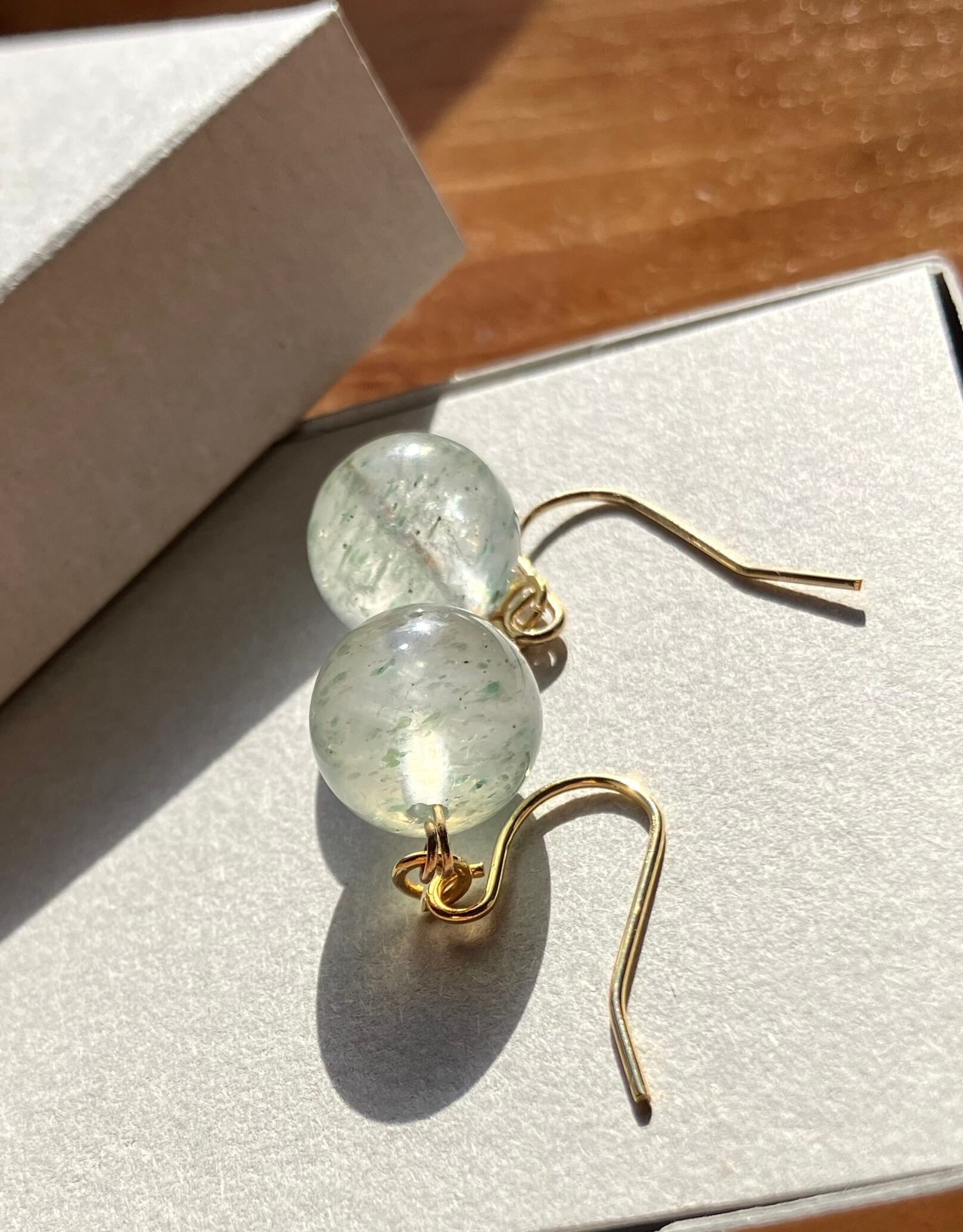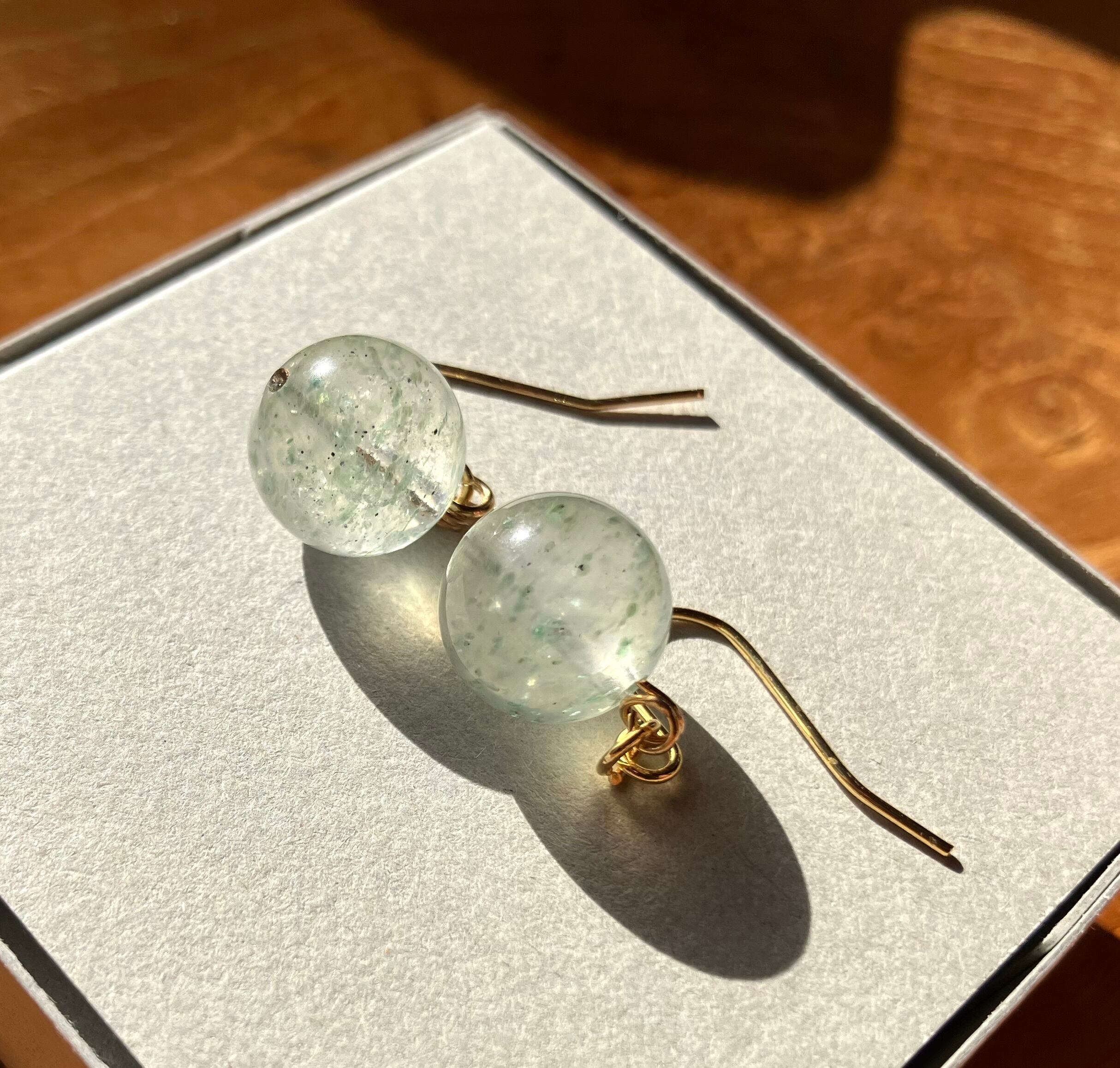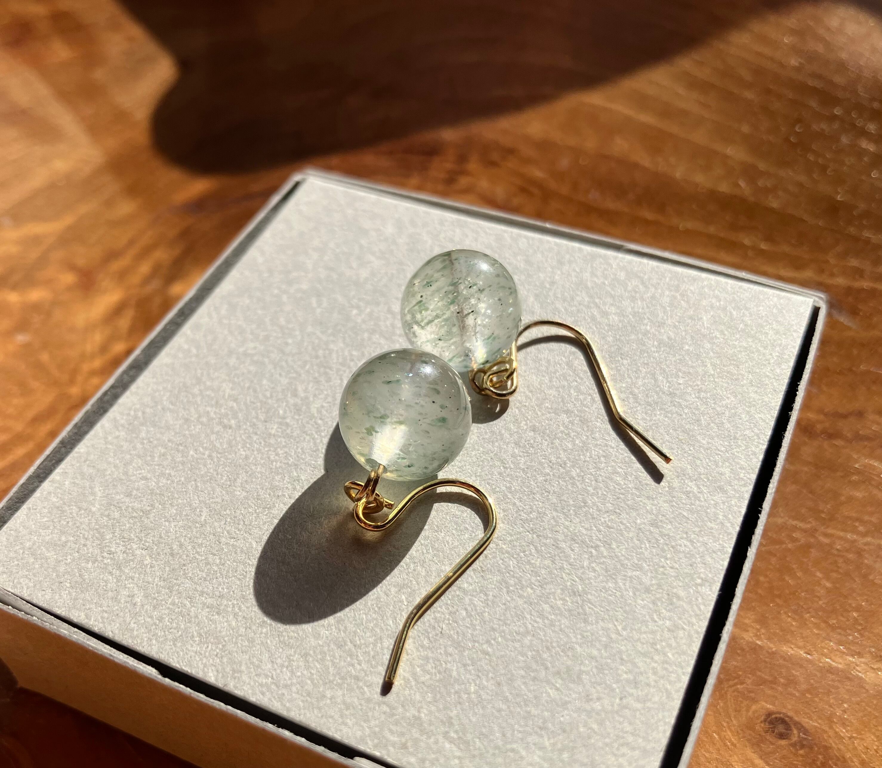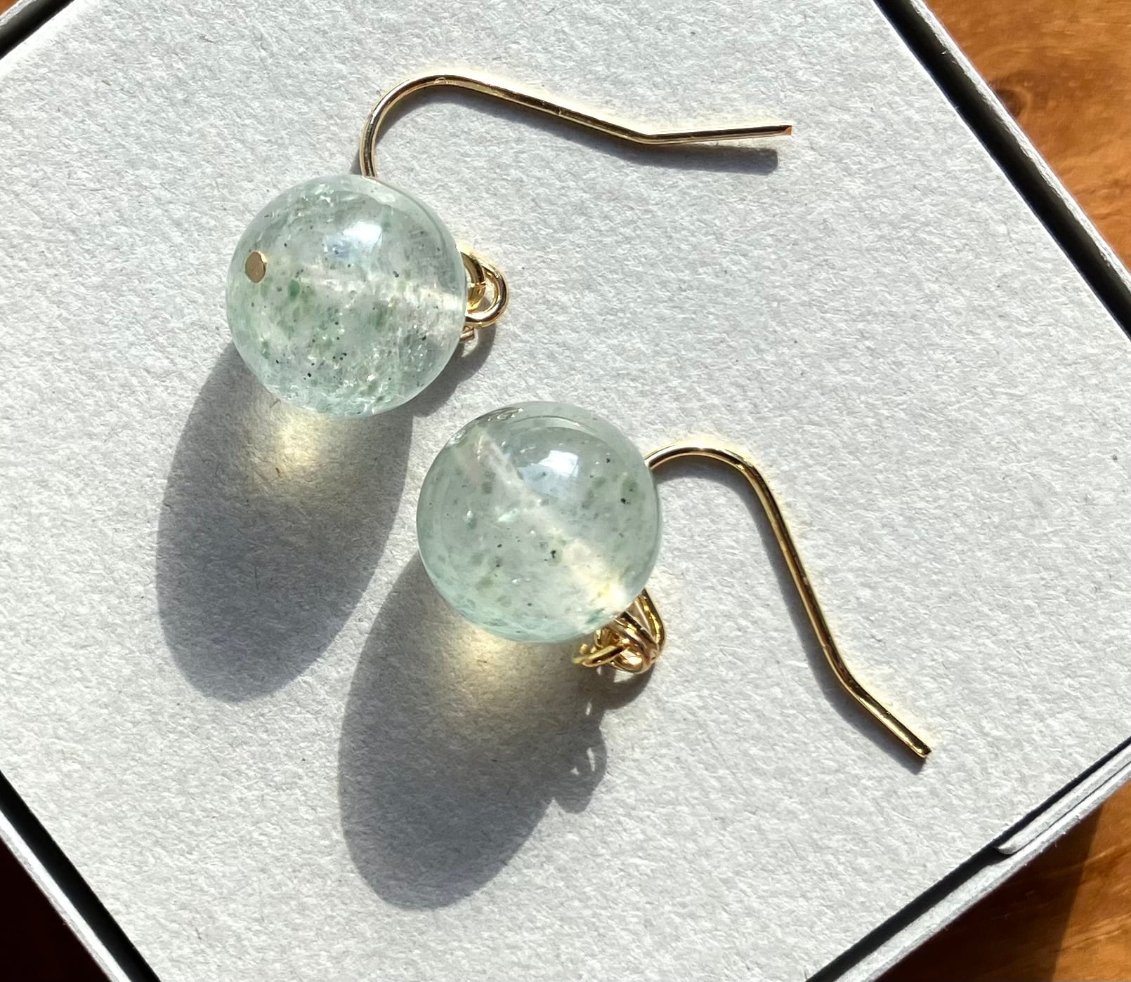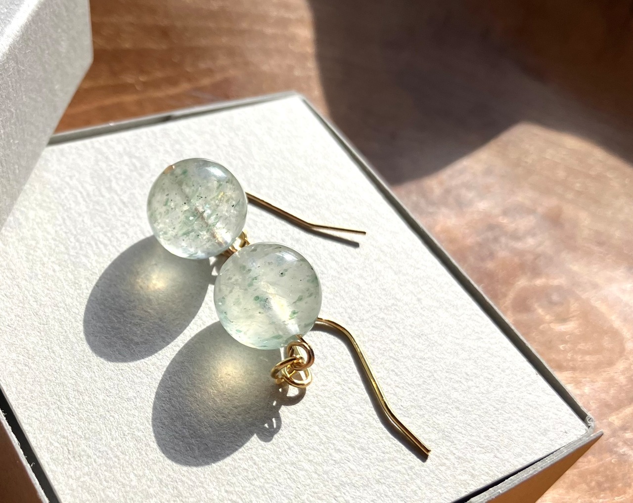 金具部分は、アレルギー対策として、ピアスフックパーツ部分は14KGF(14金ゴールドフィルド)を使っています。真鍮に14金の層を高熱と圧力で圧着させたもので14金の層の重量が総重量の1/20以上のものをいいます。金メッキの約100倍の厚さがあるので、剥がれることはほぼなく長く愛用できるものです。