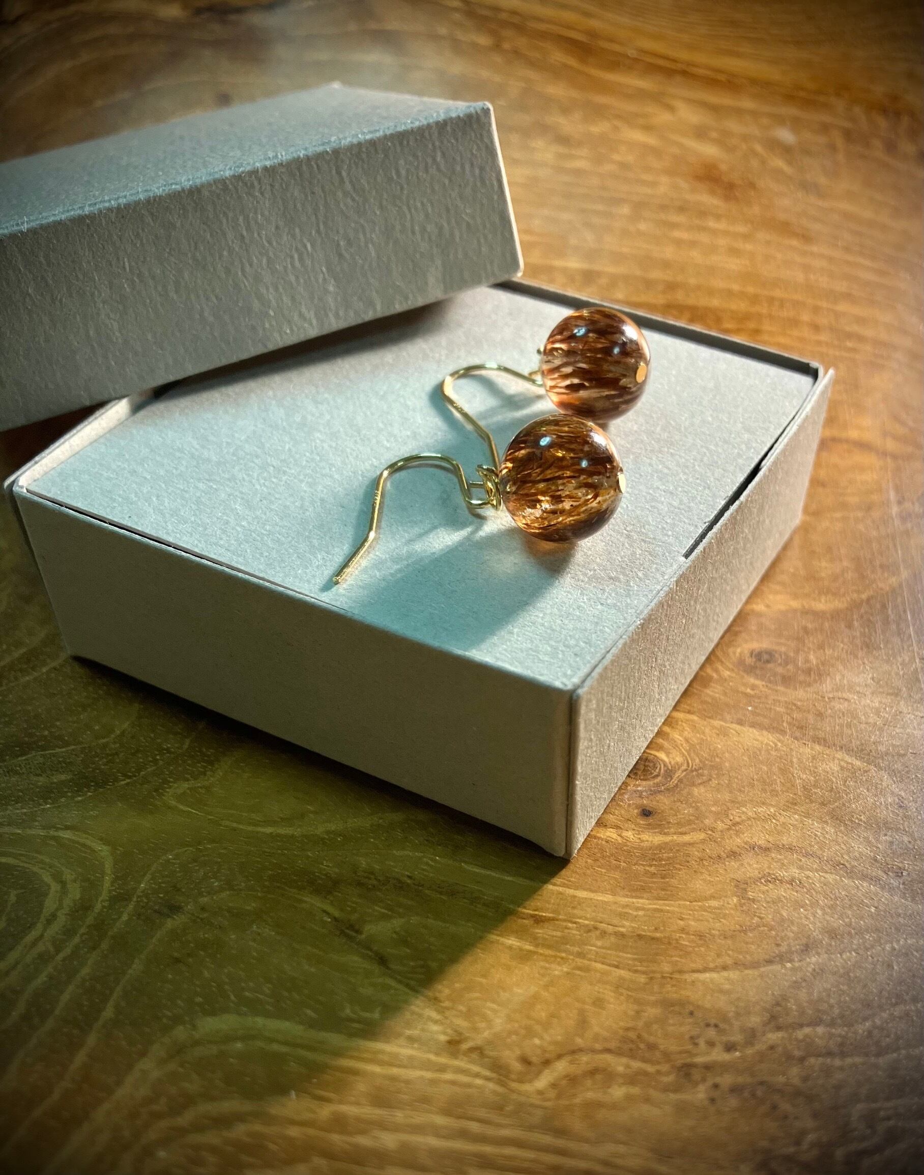 金具部分は、アレルギー対策として、ピアスフックパーツ部分は14KGF(14金ゴールドフィルド)を使っています。真鍮に14金の層を高熱と圧力で圧着させたもので14金の層の重量が総重量の1/20以上のものをいいます。金メッキの約100倍の厚さがあるので、剥がれることはほぼなく長く愛用できるものです。