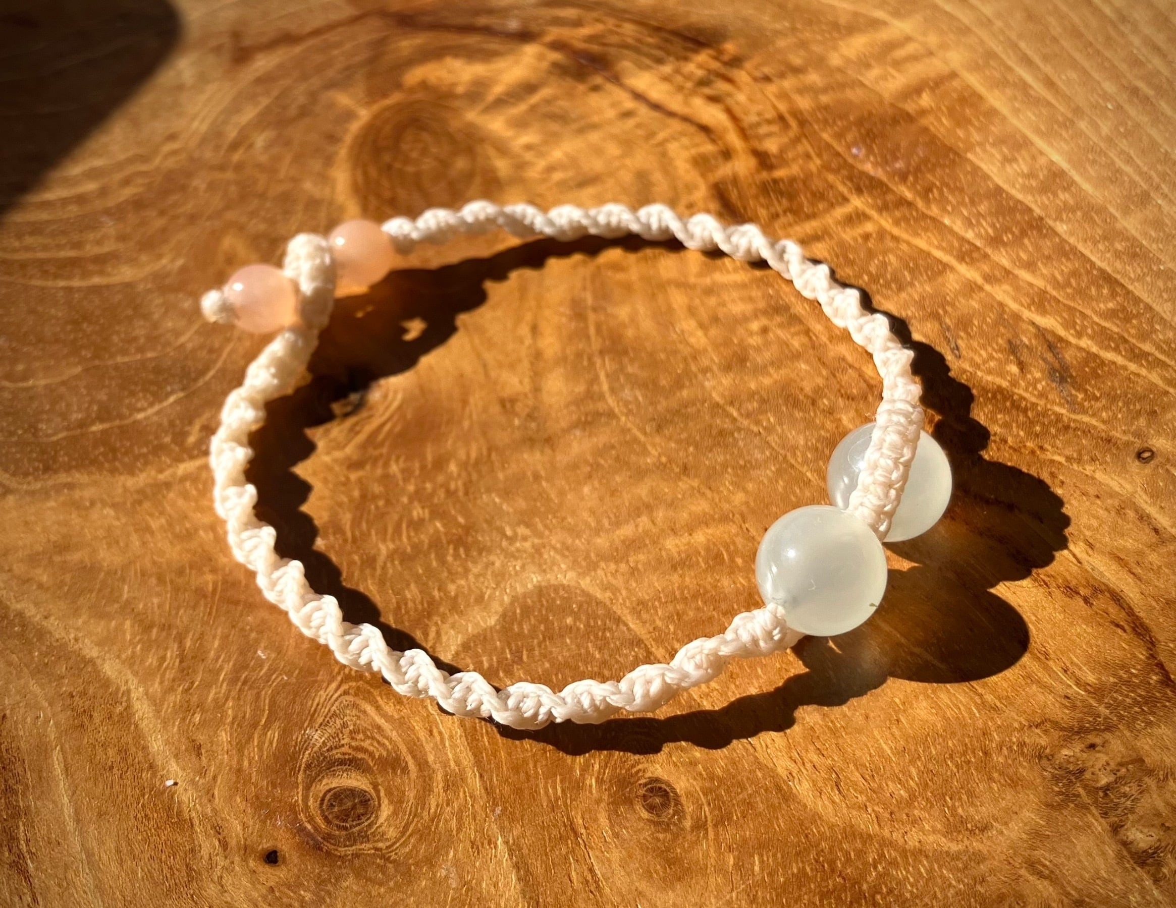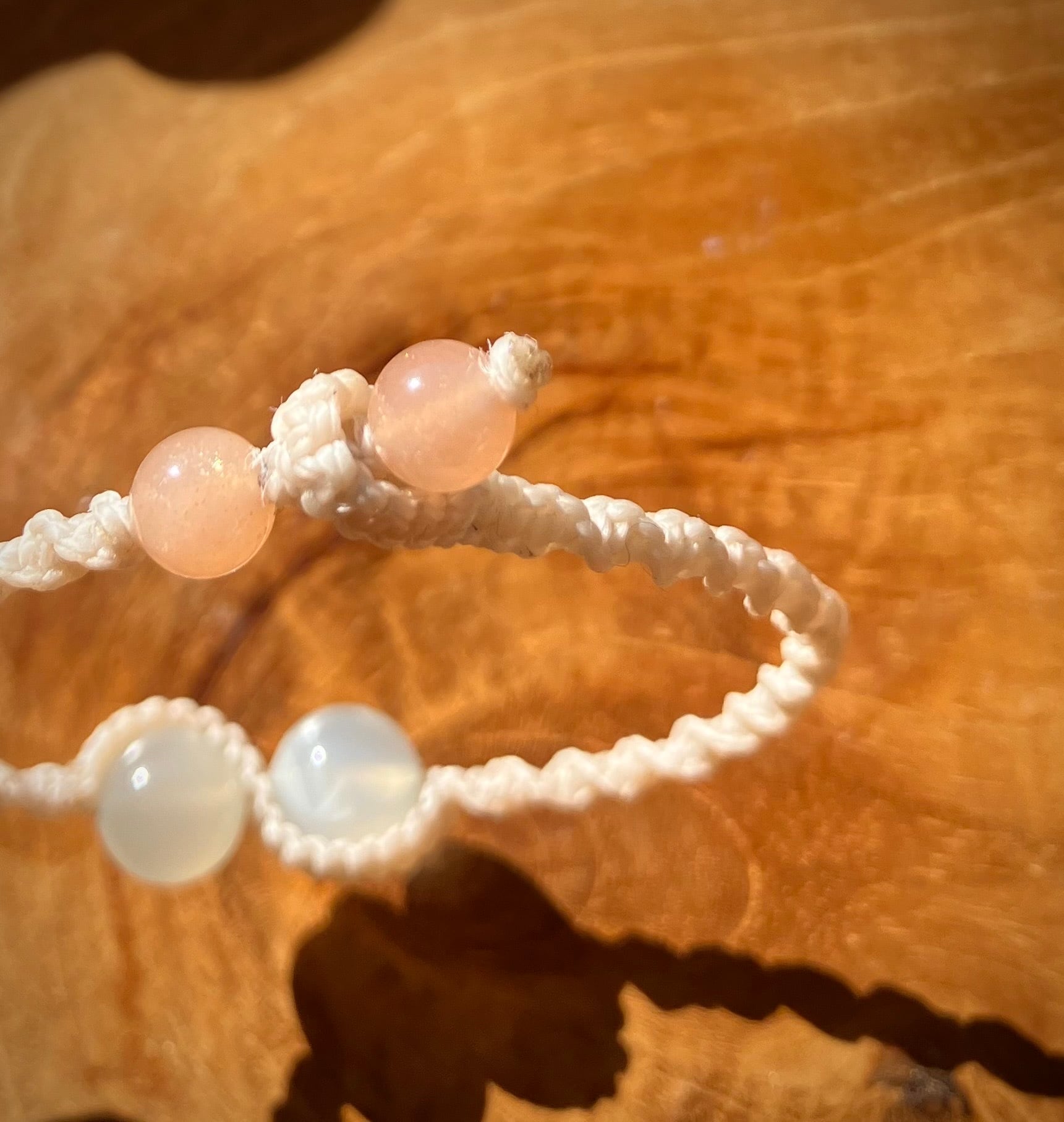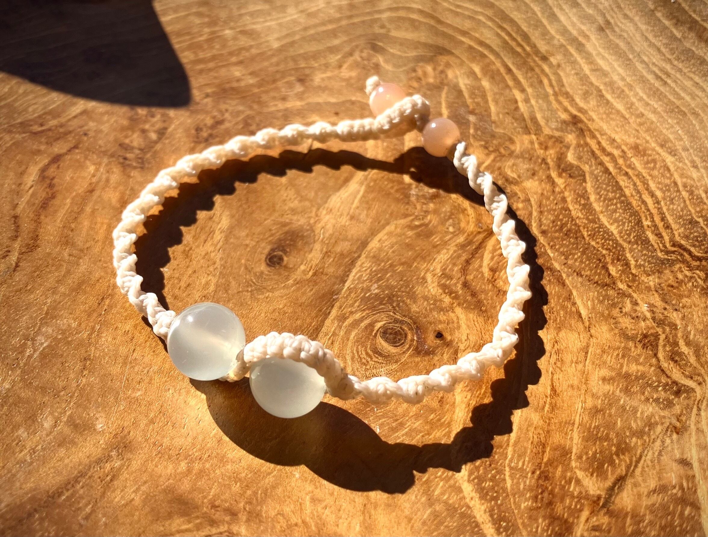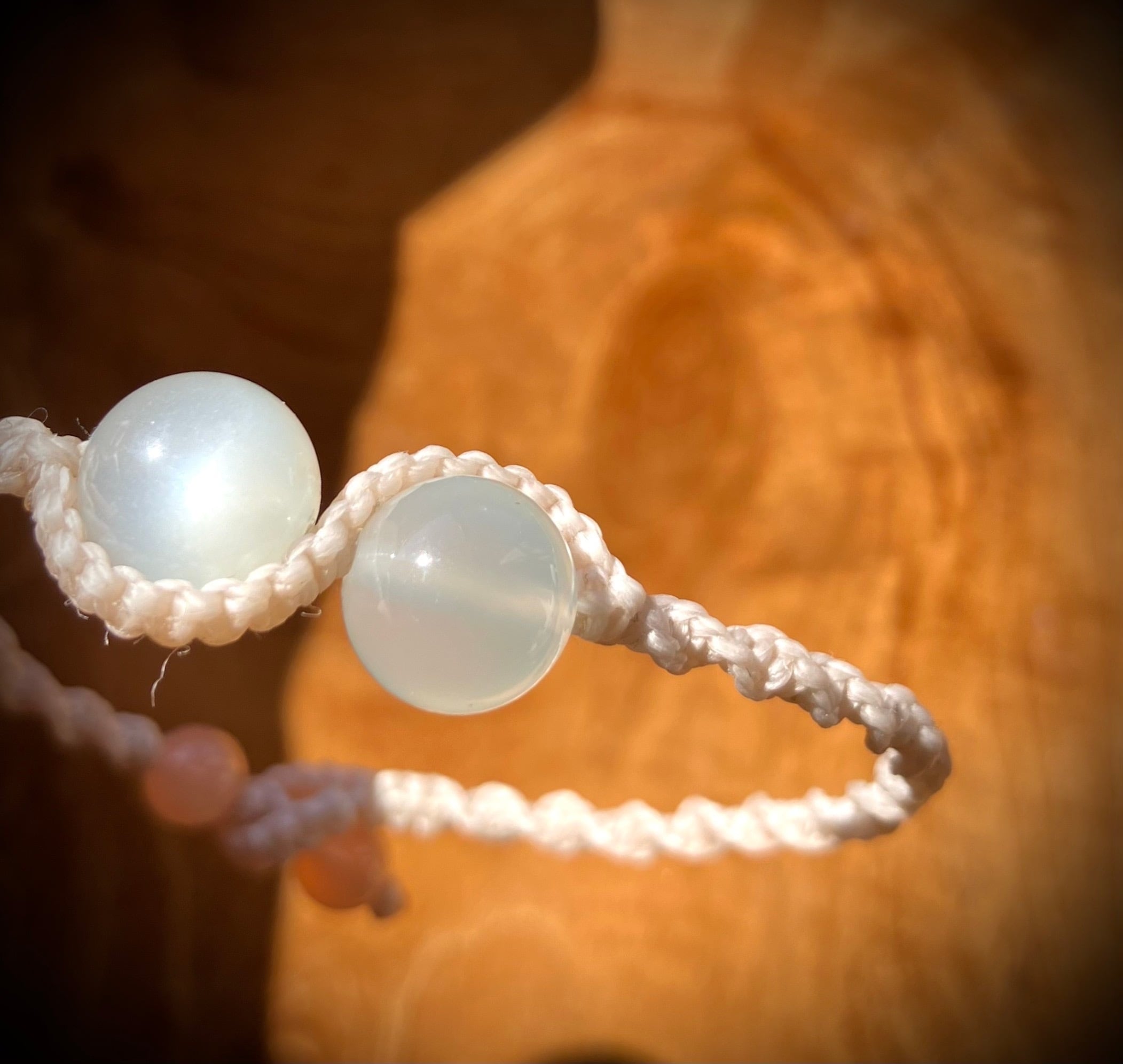 こちらのブレスレットは、マクラメ紐で編み上げております。ポイントのパワーストーンは、ムーンストーンです。ムーンストーンは、月の魔力の化身として神聖視されていました。古代インドの人々は、ムーンストーンを「聖なる石」として崇め、お守りとして身に着けていたそうです。夜道を照らす月明かりのように、真実を授け、危険から身を守る力を与えてくれると考えられていました。また、エンドの2つのパワーストーンはオレンジムーンストーンです。オレンジムーンストーンの石言葉は「創造性」「エネルギーの注入」「喜び」「バランス」「感情の解放」と多彩です。この美しい宝石は、特に創造性を高め、新たなアイデアやプロジェクトにエネルギーを注入し、喜びと活力をもたらすとされています。また、感情的なバランスを取り戻し、感情を解放し、ポジティブな感情を促進する要素としても知られています。オレンジムーンストーンは創造性と感情の豊かな世界にアクセスする手助けをし、その輝きは新たな始まりと活力を象徴します。こちらのブレスレットのパワーストーンには施術を施しており、この石が持つパワーを最大限に引き出してありますので、気感のある方ですと、手を近づけると圧迫感を感じられると思います。