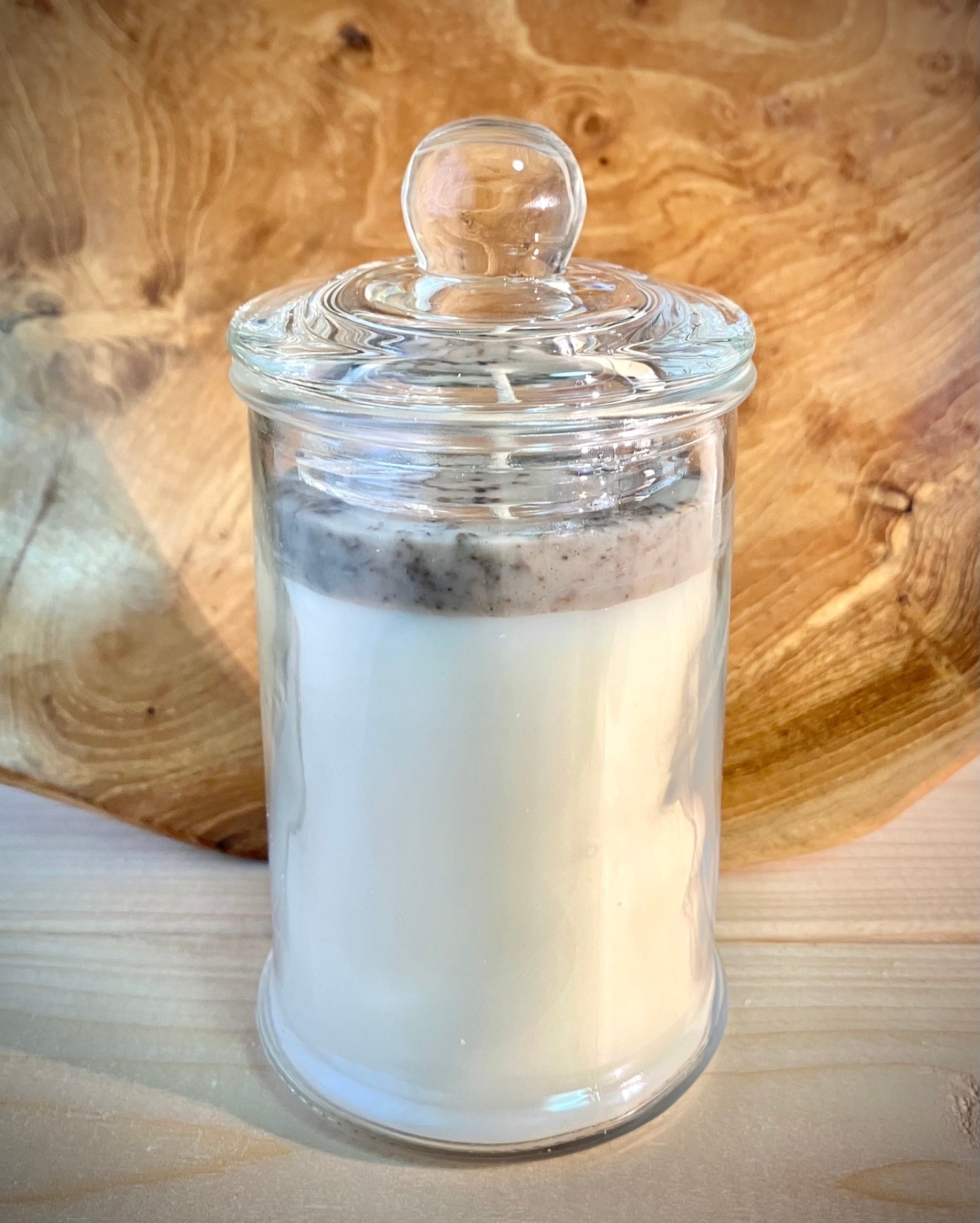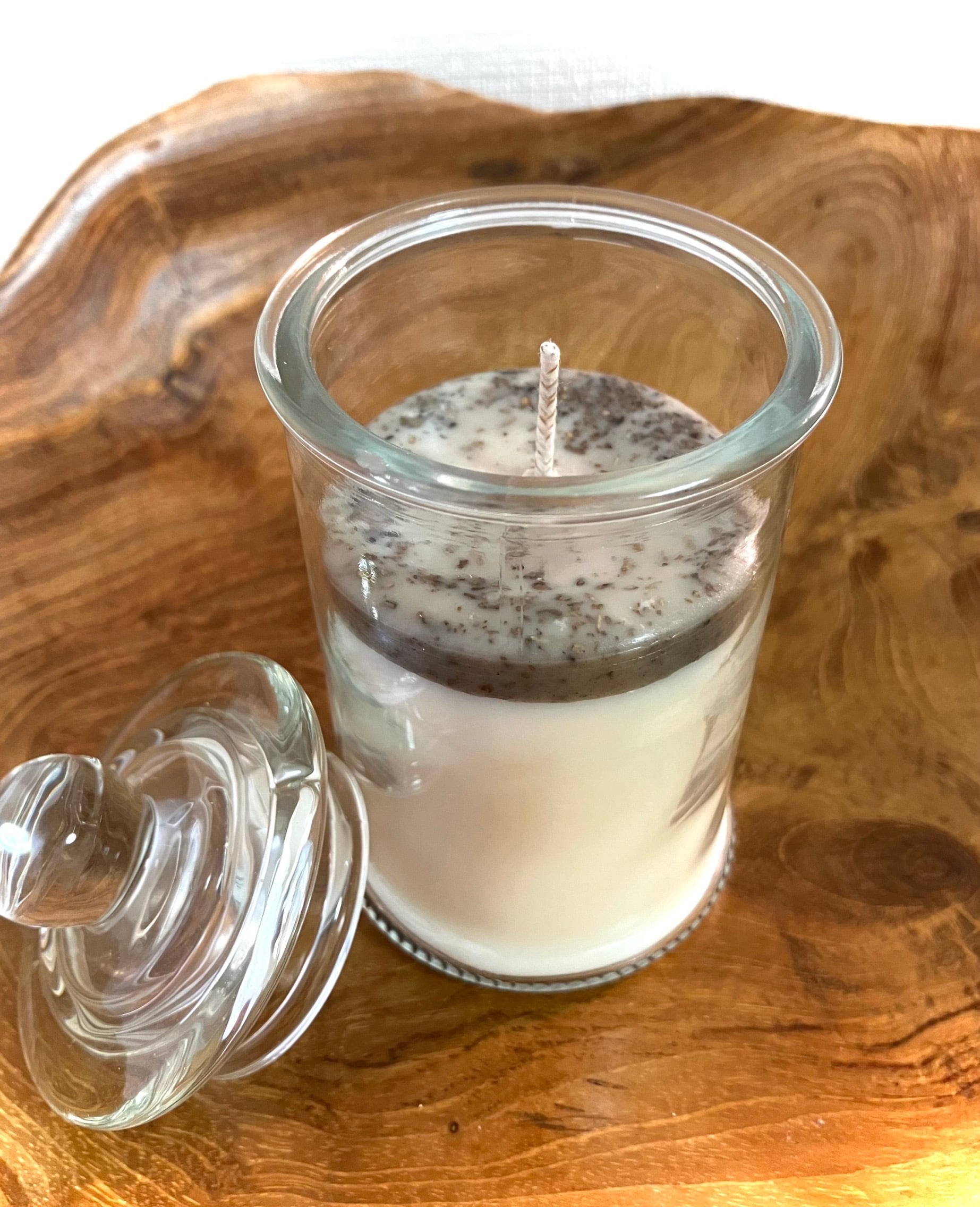 付属のガラスの蓋はキャンドルスナッファーとしてお使いいただけます。(消火の時は蓋を閉めていただくと自然と消えます。)また使用していない時、蓋をしておくことで埃を防ぐこともできます。