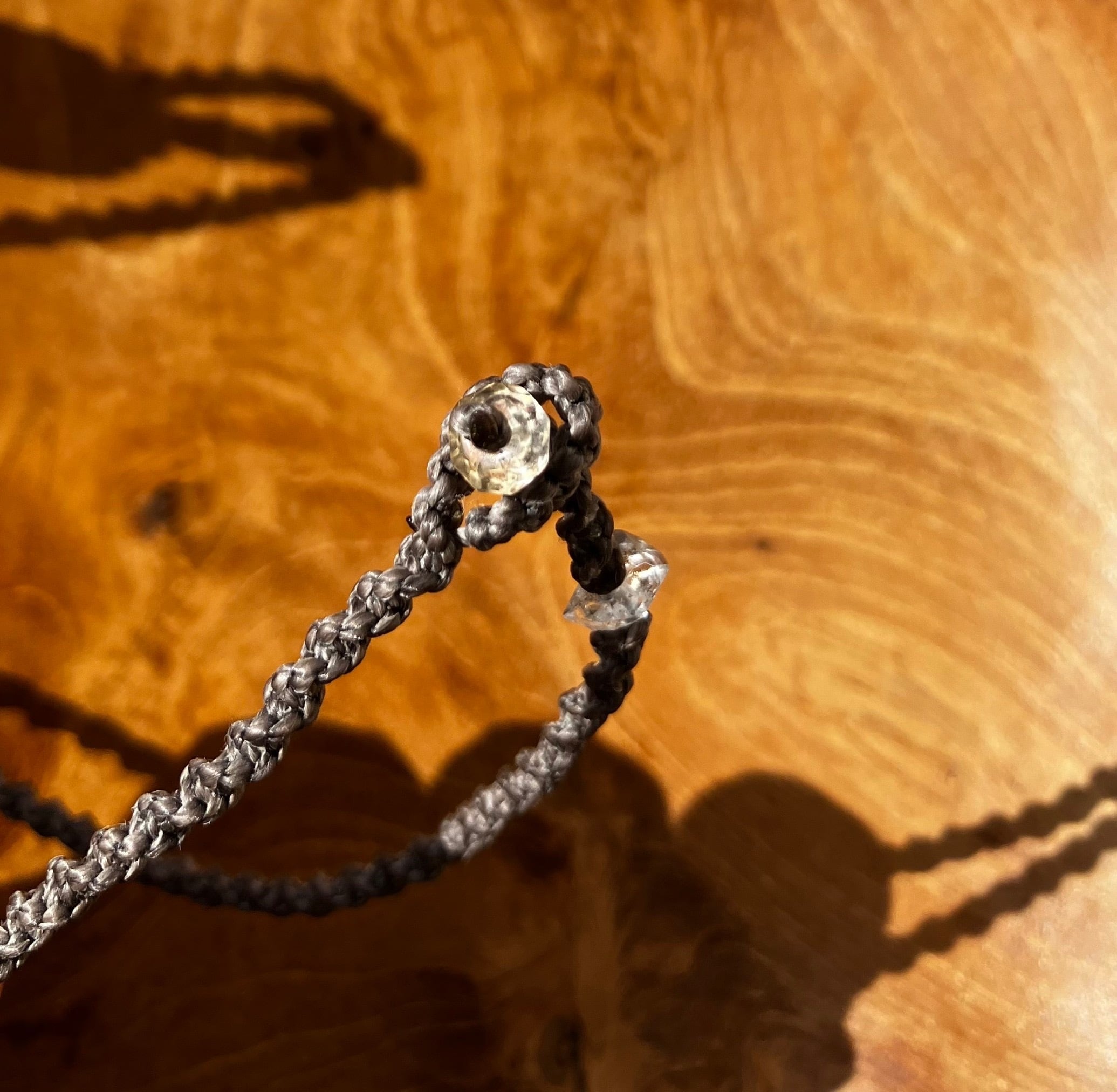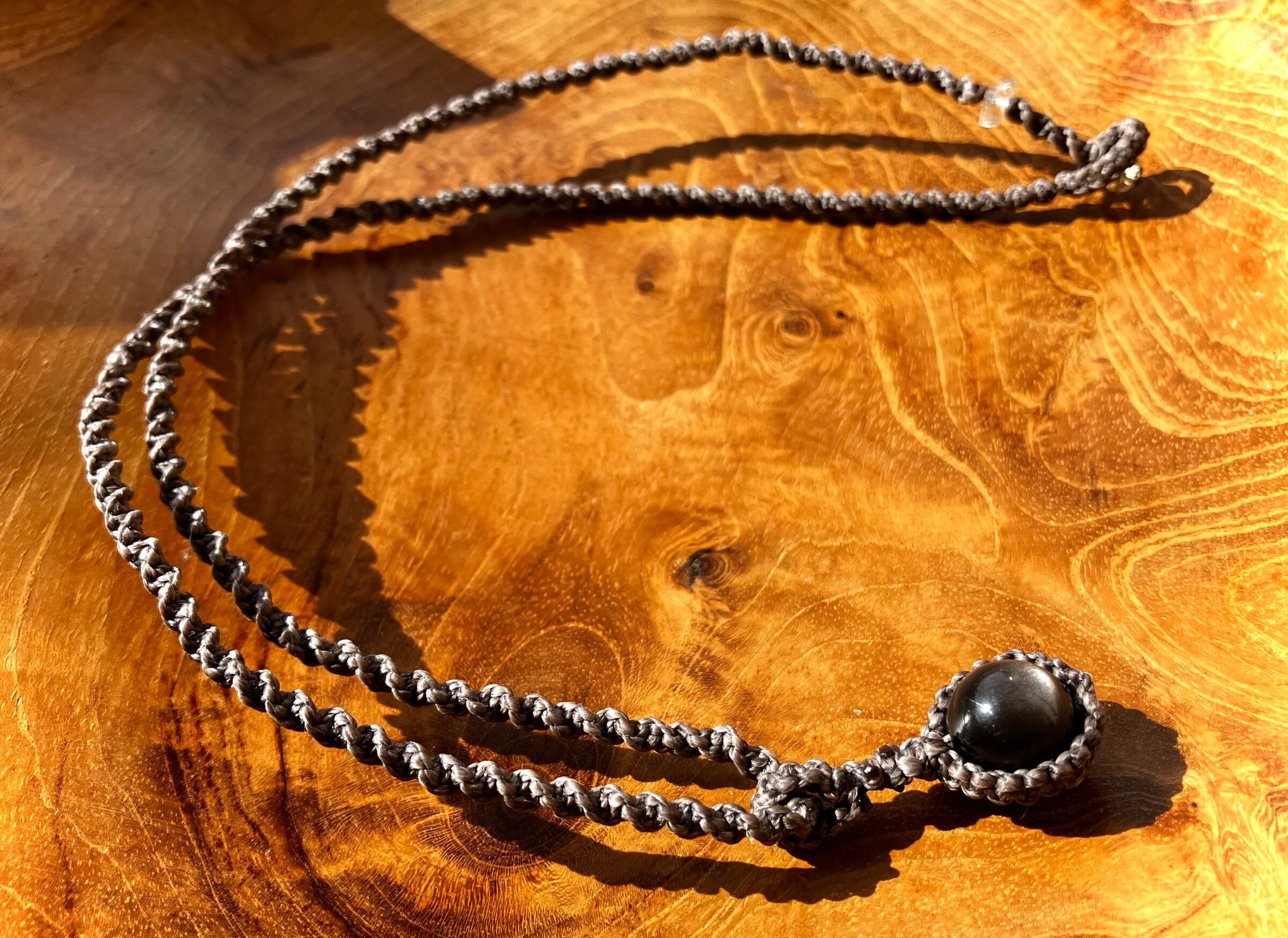 こちらのネックレスのトップのパワーストーンは、シルバーオブシディアンです。シルバーシーンオブシディアンはほかのオブシディアングループの石と同様に、内的自己の鏡としてのはたらきがあります。一生を通じて効果をもたらし、必要に応じて忍耐と根気を与え、思考パターンの浄化につなげてくれます。また、アストラル体と肉体を結び付け、魂を肉体に戻す働きがあることから、肉体を離れて魂の旅(幽体離脱など)をする際に有用な石です。そしてエンドには、オイルインハーキマーダイヤモンドを付けました。オイルインハーキマーダイヤモンドは、その名が示す通り石油入りの水晶です。