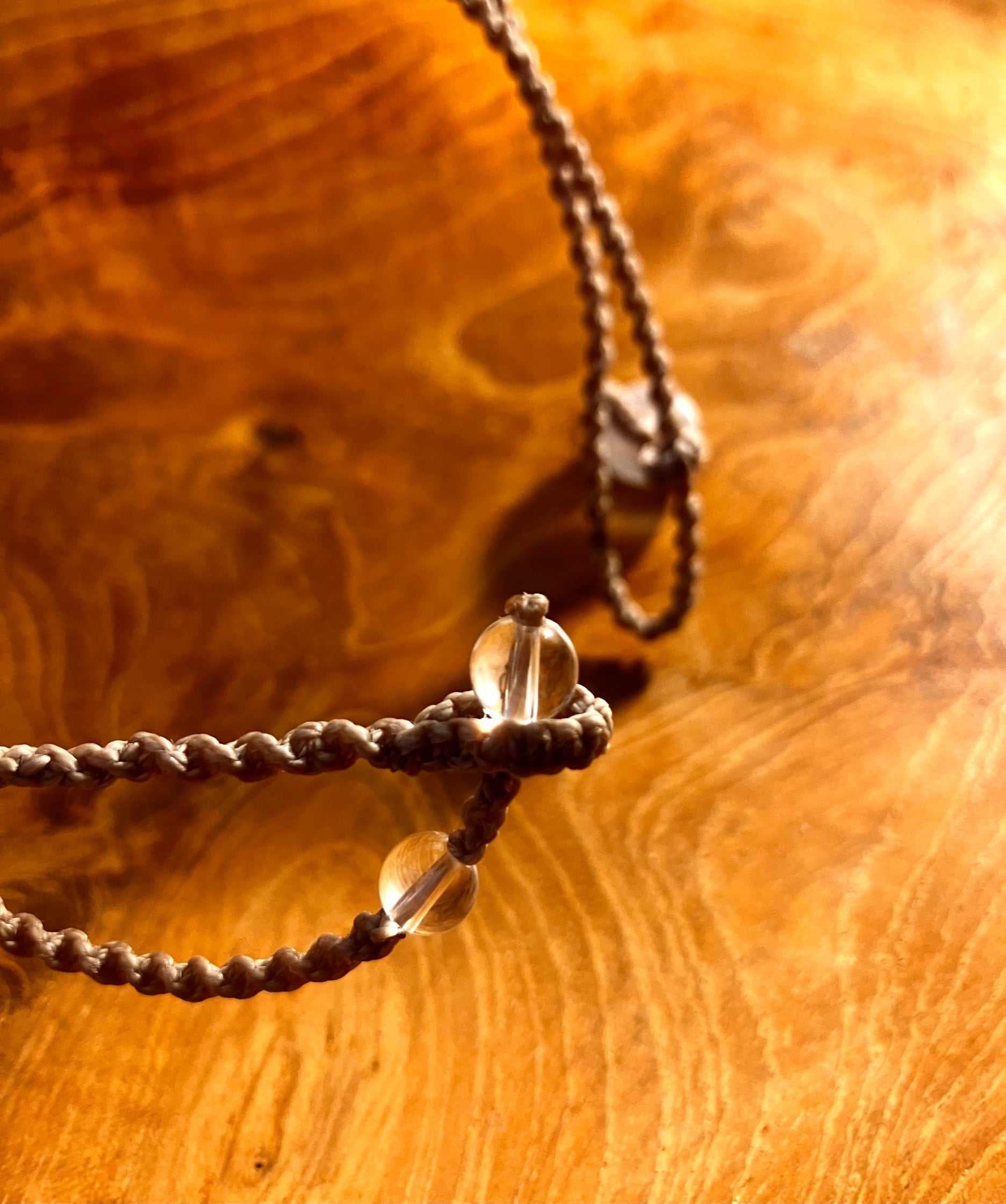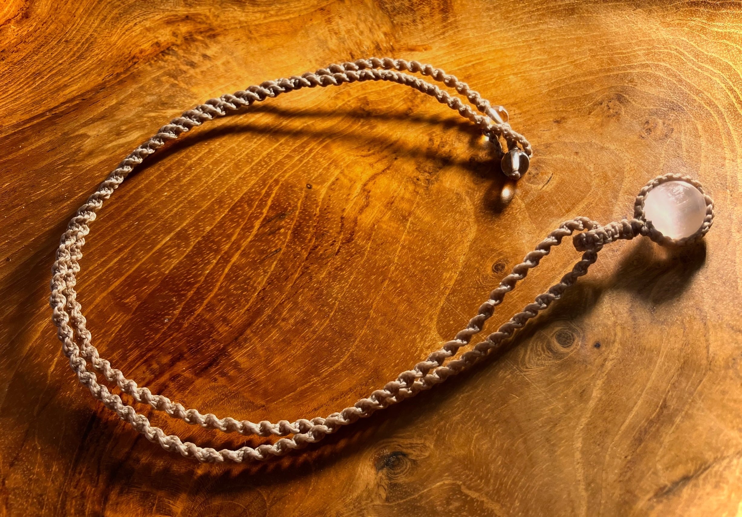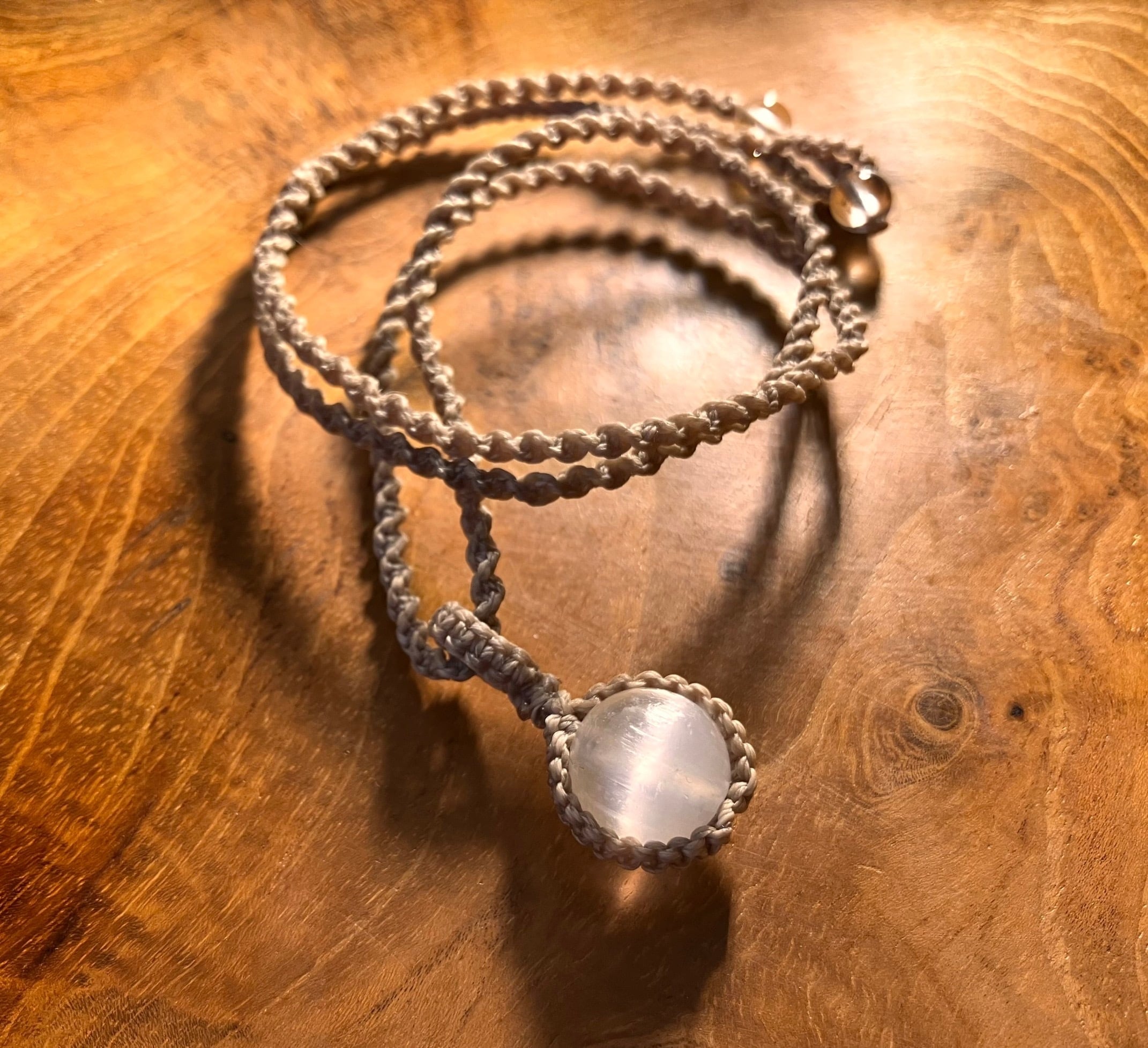 こちらのネックレスは、マクラメ紐で編み上げております。ポイントのパワーストーンは、セレナイトです。身につけると自己の高次意識と繋がるよう、施術を施しております。