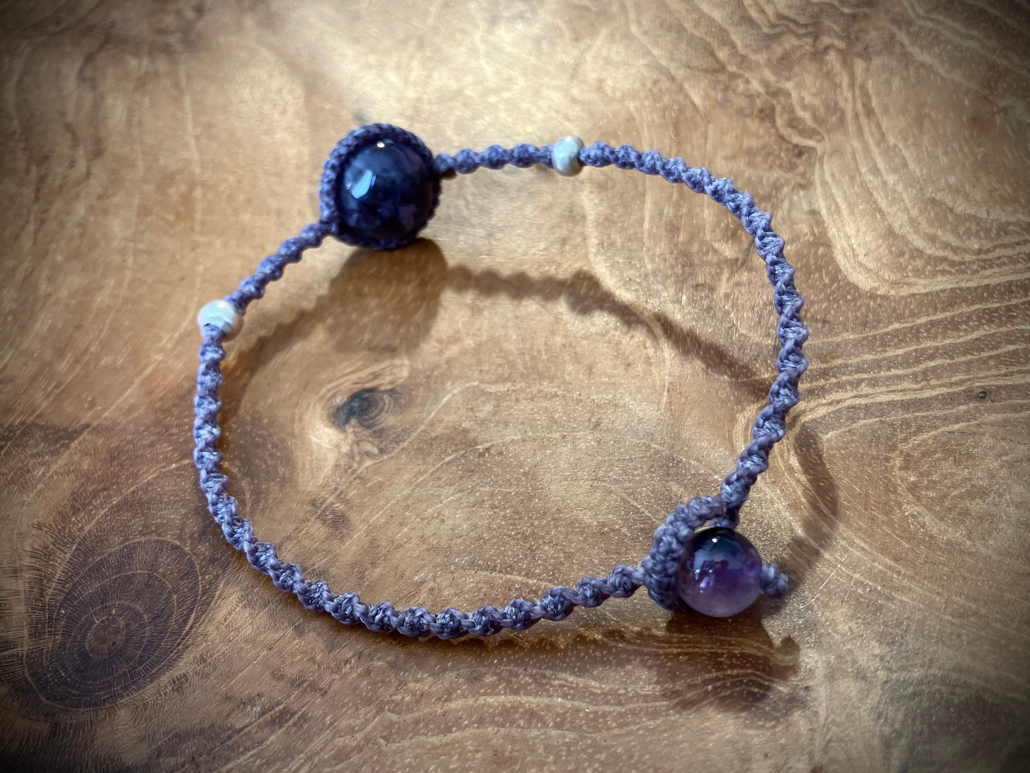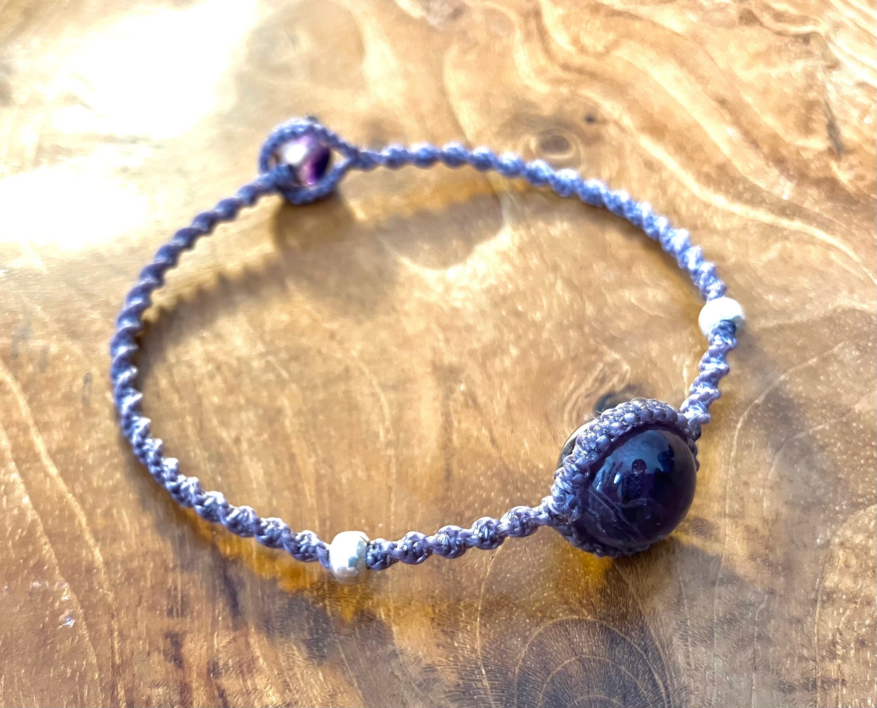 こちらのブレスレットは、マクラメ紐で編み上げております。ポイントのパワーストーンは奇跡の石と言われるオーラライト23です。エンドは最強のパワーストーンと言われるスーパーセブンです。純銀無垢のビーズを加えております。