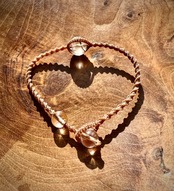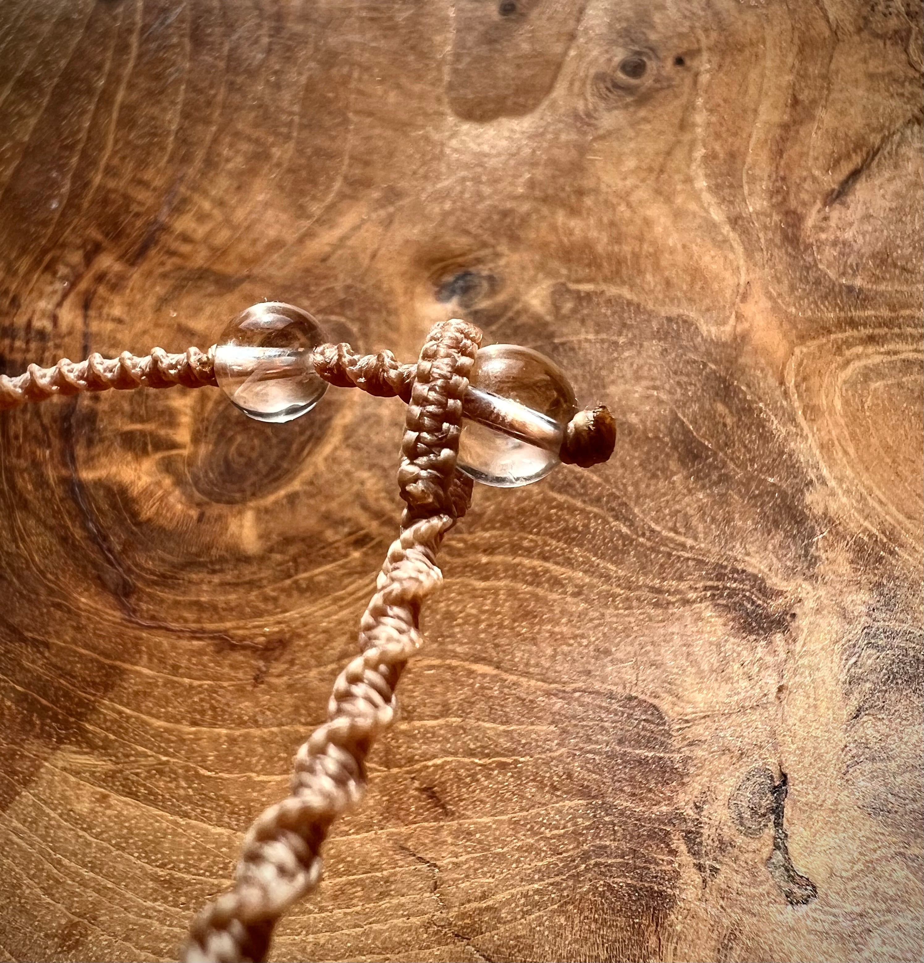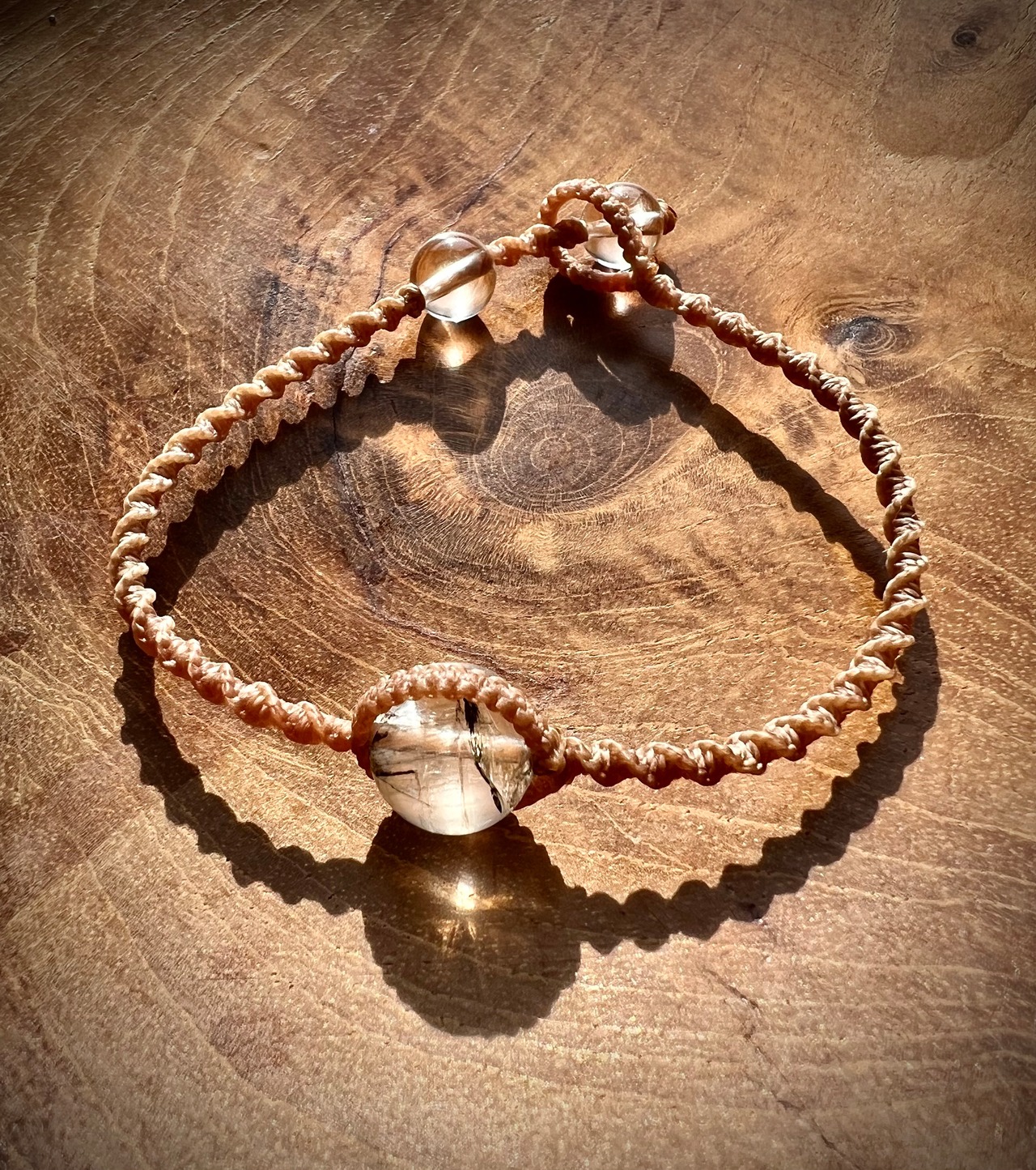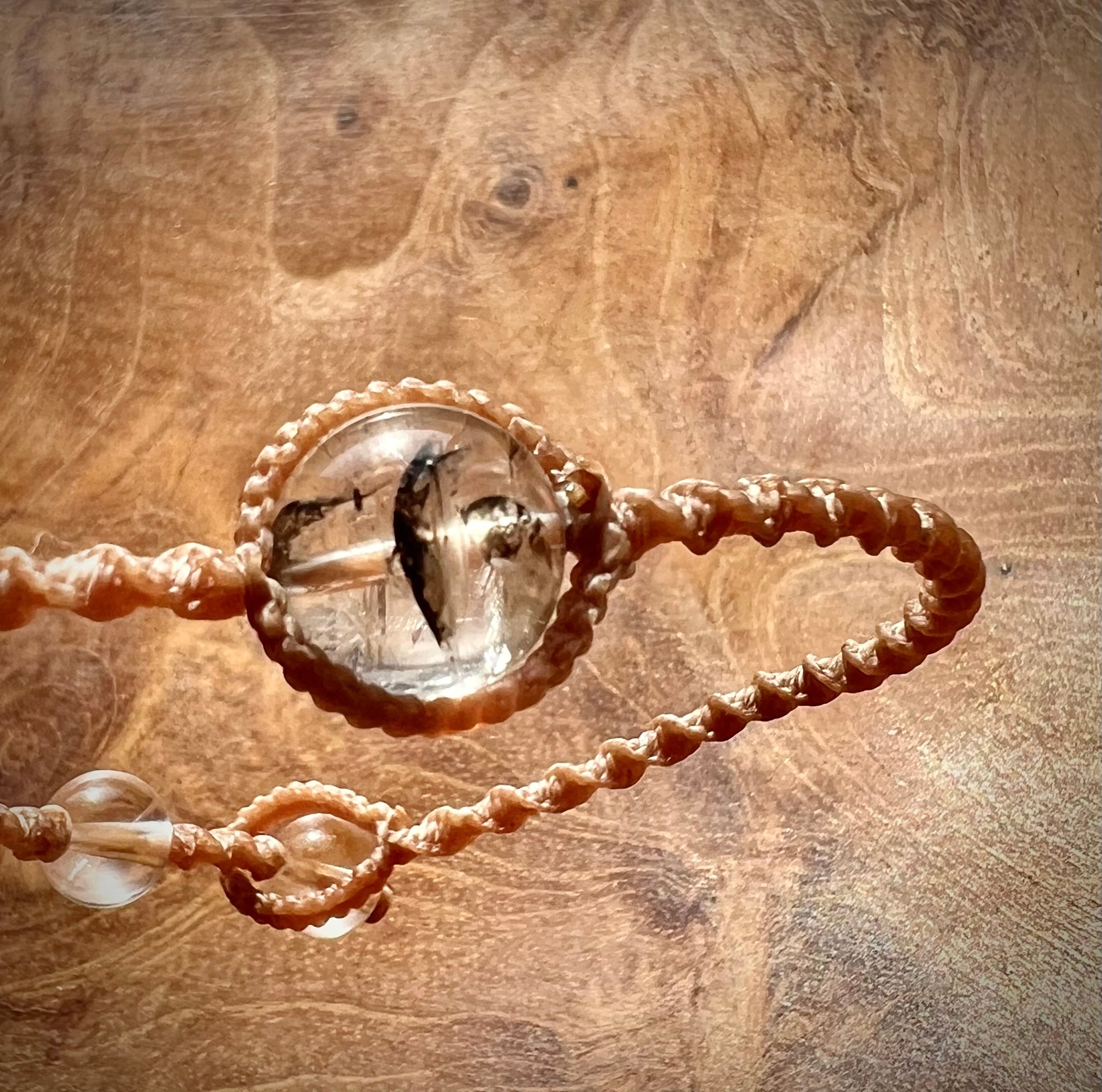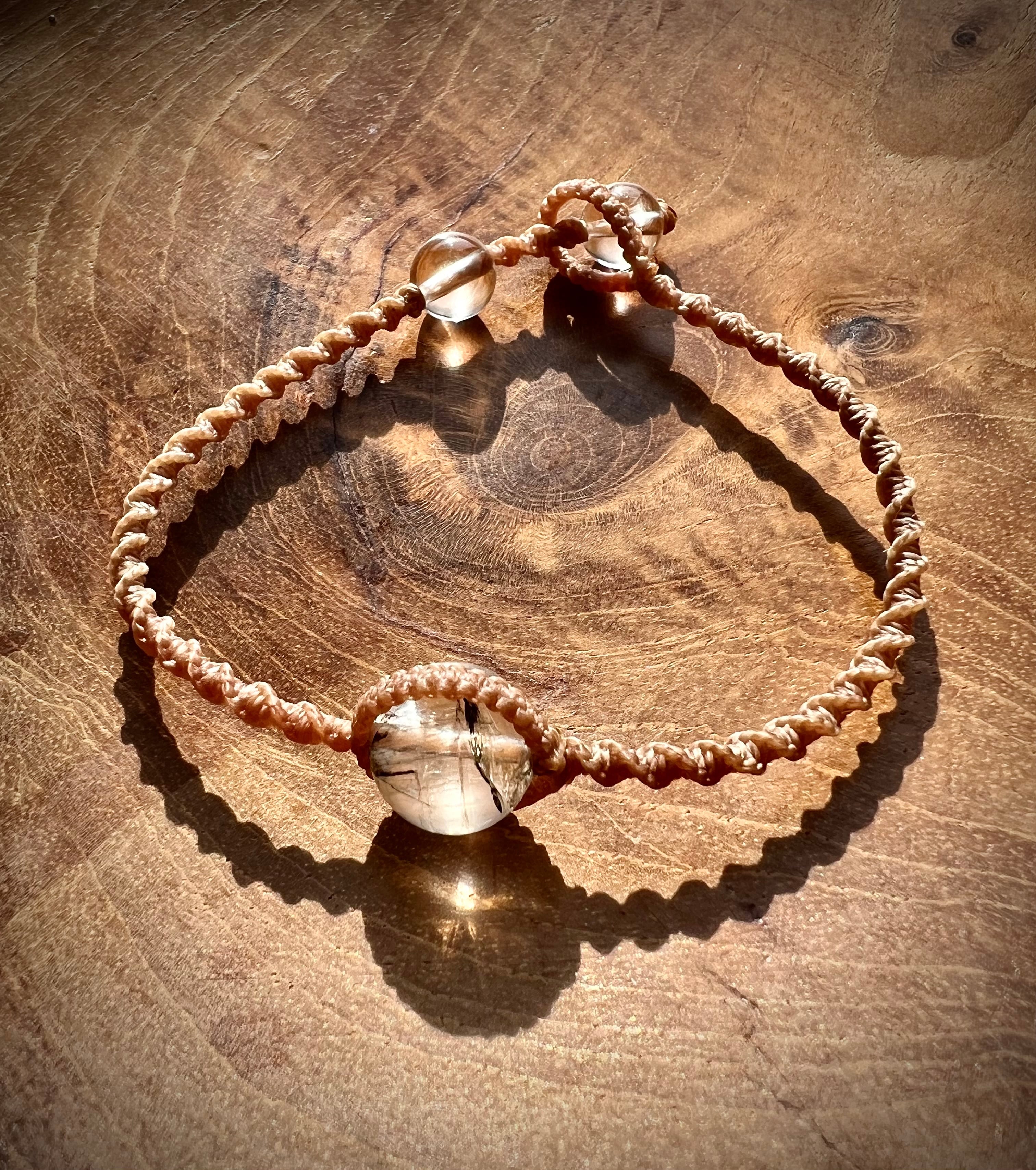 こちらのブレスレットは、マクラメ紐で編み上げております。ポイントのパワーストーンは、タールインクォーツでエンドの石は水晶です。